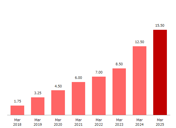 The Company executed 2-for-1 stock splits of its common stock on October 1, 2017, on October 1, 2018, on January 1, 2021,and on October 1, 2025. Dividend per share amounts have been retroactively adjusted as if all stock splits had occurred at the beginning of the fiscal year ended March 31, 2017.