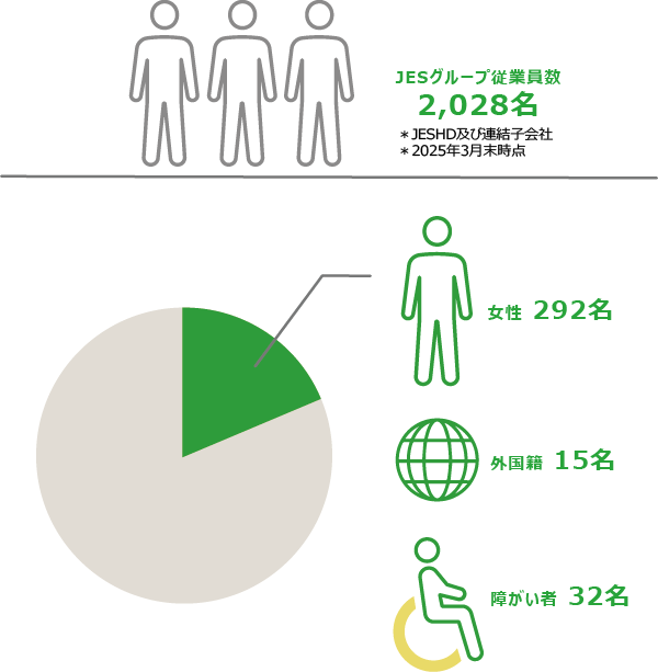 事業を支える最も重要な基盤は人材であると考えており、従業員の安全を確保すること、従業員一人一人が働きやすく、やりがいをもって職務を遂行できる環境を整えることで、JESグループの持続的な発展へと繋げていきます。2025年3月末における従業員数は2,028名と、事業の成長に合わせた新卒・中途採用の実施により人員は増加しています。